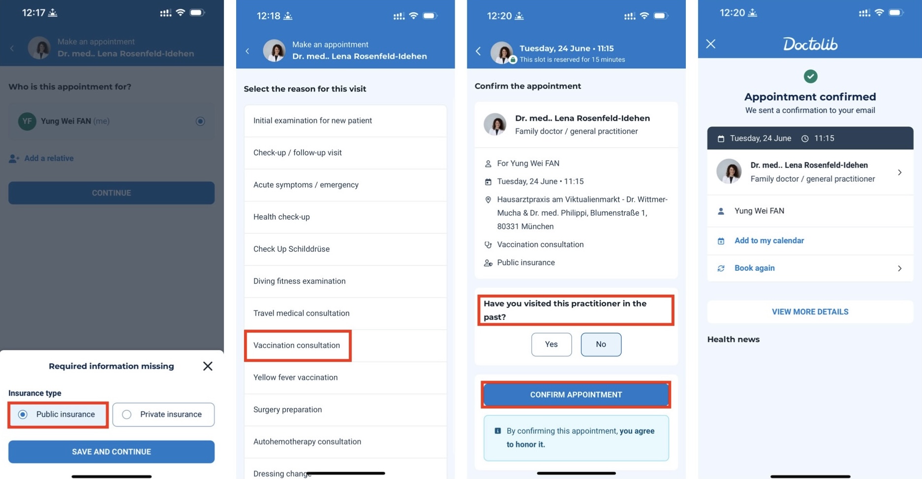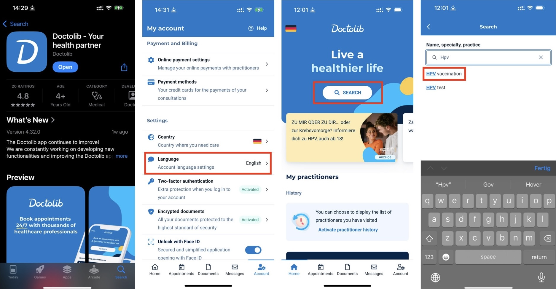 👉 小提醒:雖然家庭醫生(Hausarzt)和婦科醫生(Frauenarzt)原則上都可以施打 HPV 疫苗,但實際上並非每間診所都提供此服務,有時可能會被轉診或需另行安排。使用 Doctolib 預約時,直接選擇「HPV vaccination」服務類型,可以幫你快速篩選出真正提供施打的診所,避免白跑一趟。