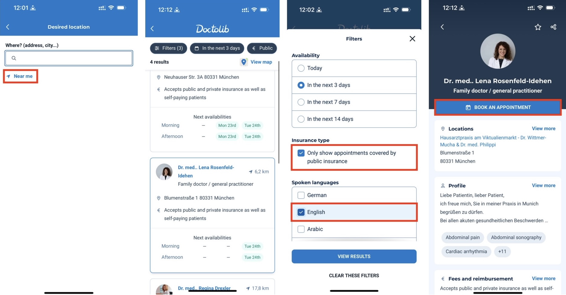 我自己實測後,最推薦也最方便的方法就是使用 Doctolib 線上預約平台。這是德國非常常見的看診工具,App 和網站都支援英文介面,操作清楚流暢,非常適合不懂德文的使用者。你可以根據城市或郵遞區號篩選地點,也能查看每間診所提供的語言(有些醫生會標示會說英文),挑選離你最近、時間也合適的診所即可預約。