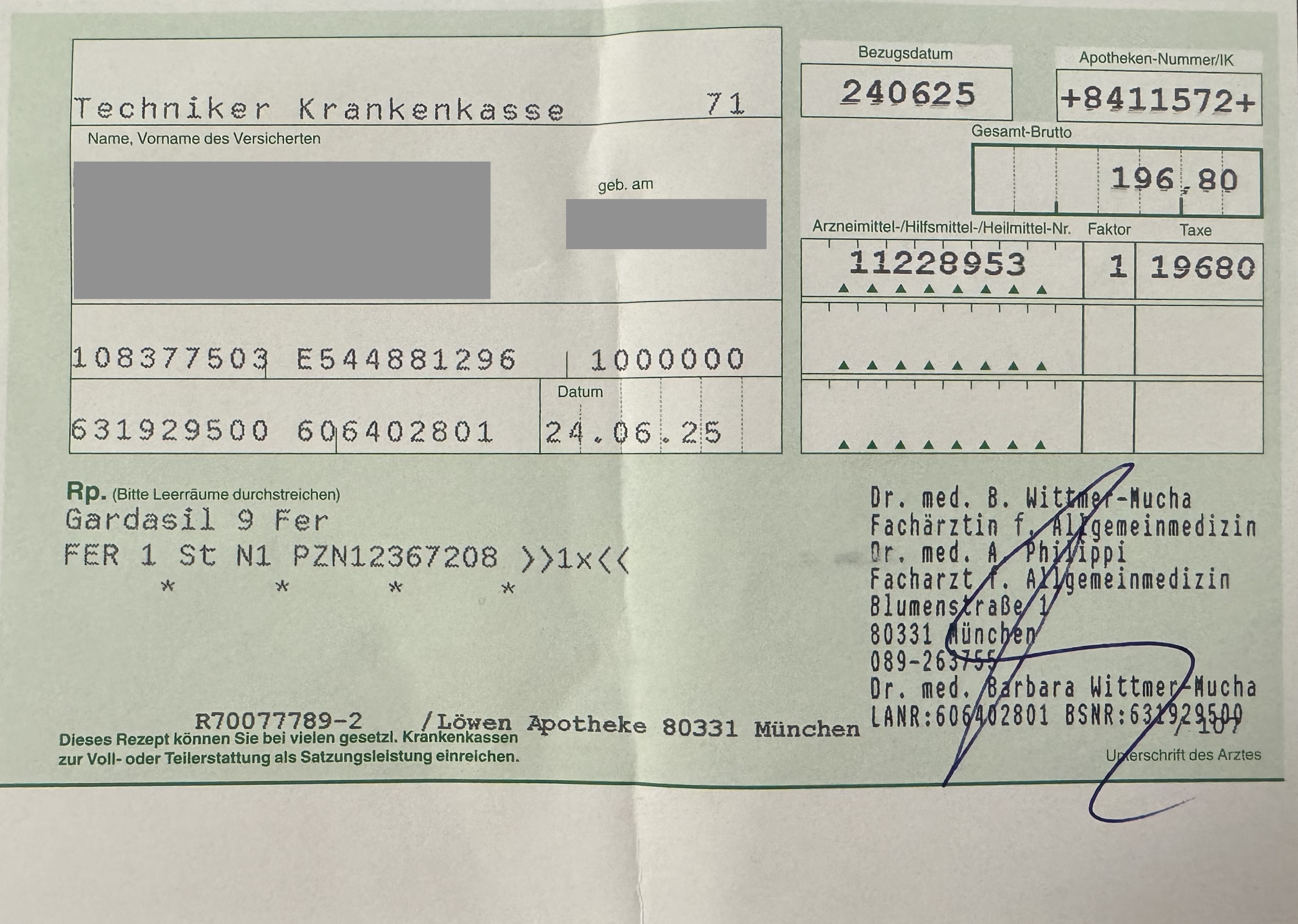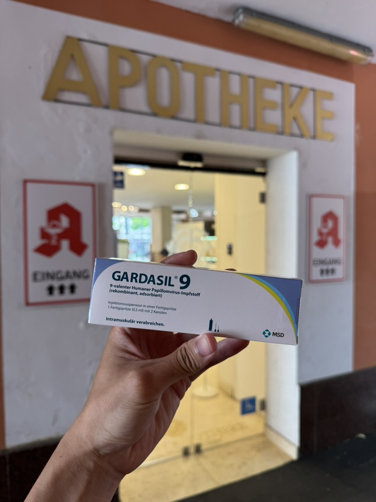 - 前往藥局(Apotheke)購買疫苗:我當時購買的九價 HPV 疫苗,價格為 €196.80,需要先自費。⚠️ 記得妥善保存收據與處方簽,之後才能向保險公司申請核銷!