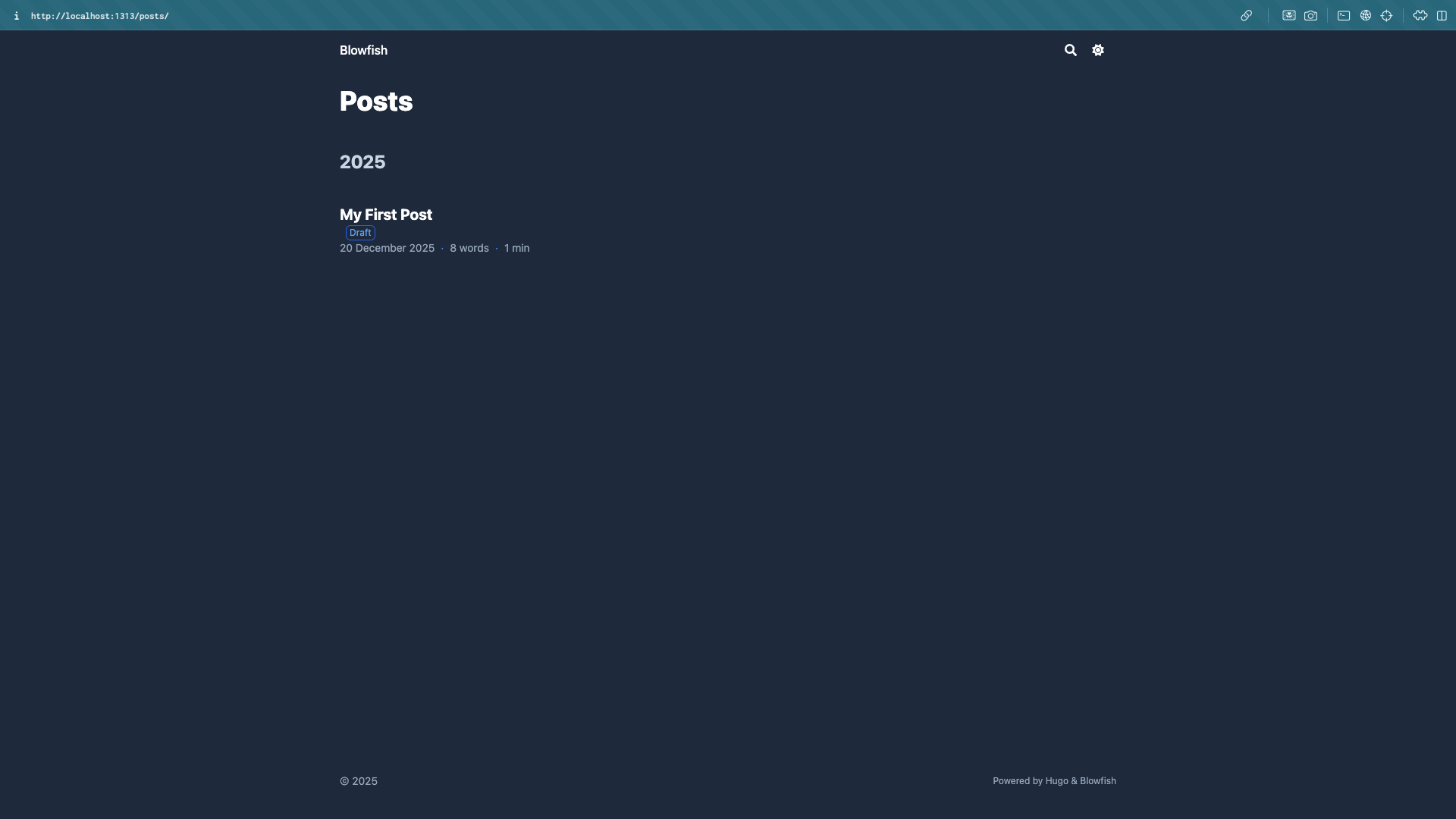剛剛的文章是在 content/posts/ 底下,所以我們瀏覽器輸入 http://localhost:1313/posts/,就可以看到我們剛剛新增的文章了!