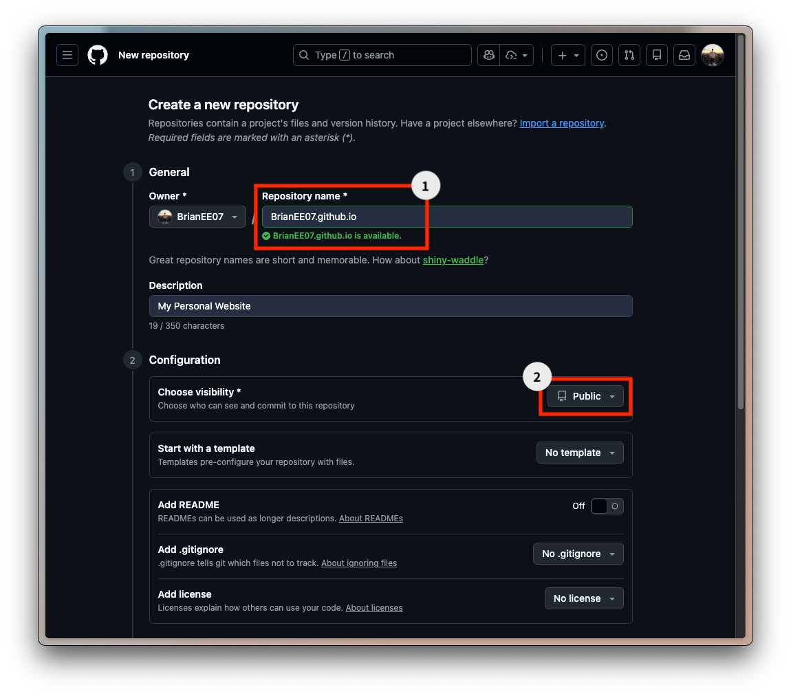 這個 Repo 的名稱建議是 <帳號名稱>.github.io,就不需要多做設定,並且要設成公開。