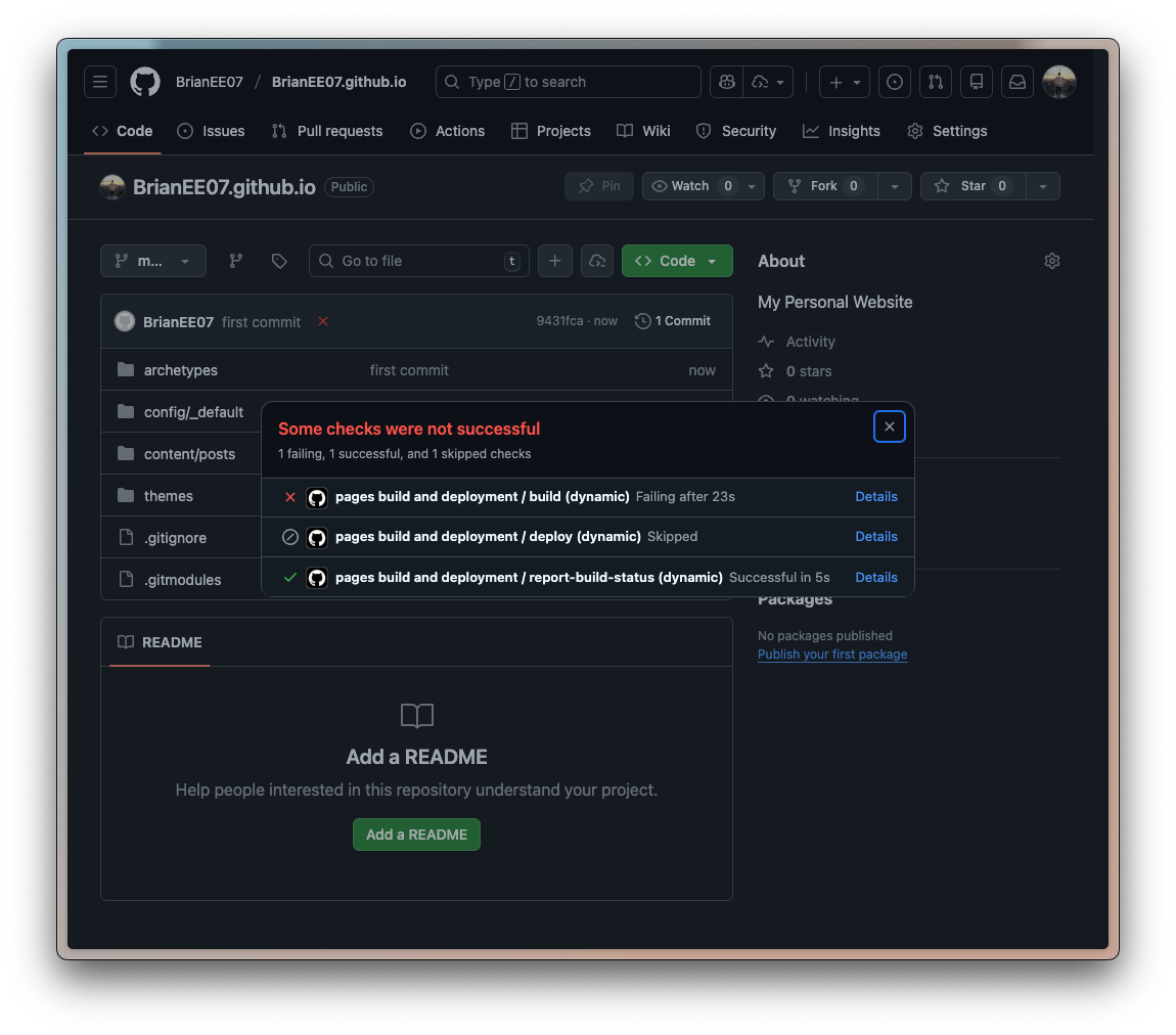 git push -u origin main上去之後有 fail 是正常的,因為 Github Pages 會幫你用 Jekyll 推一次但我們是 Hugo 所以會錯。