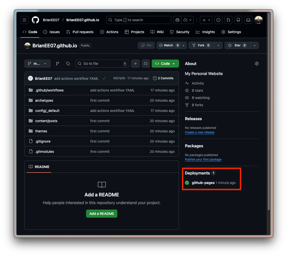 mysite/推送到<帳號名稱>.github.io這個 Repo,並在推送完成後 GitHub 那邊會自動執行 Hugo 編譯跟部署流程。